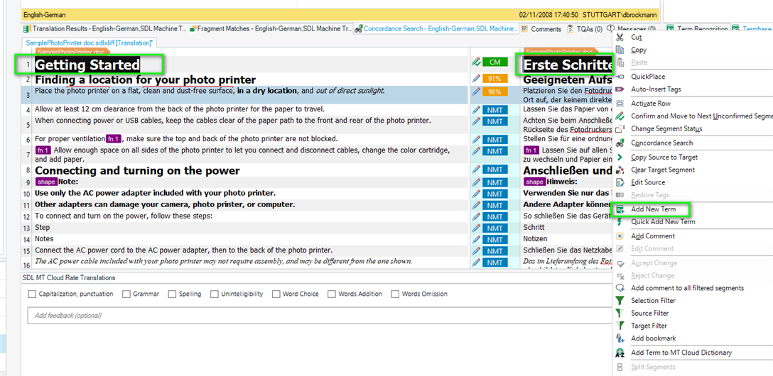 As an example, here you can see a multilingual termbase entry complete with image and two possible translations for Netzkabel.