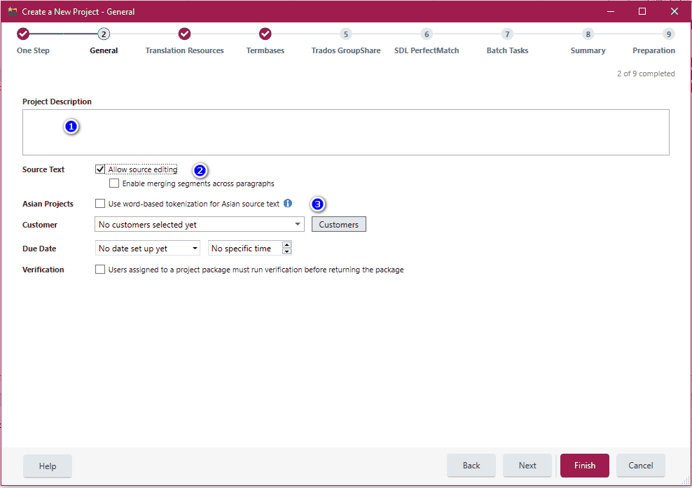 2) Select whether you wish to be able to Allow source editing (Enable merging segments across paragraphs (you can change the settings at any time)