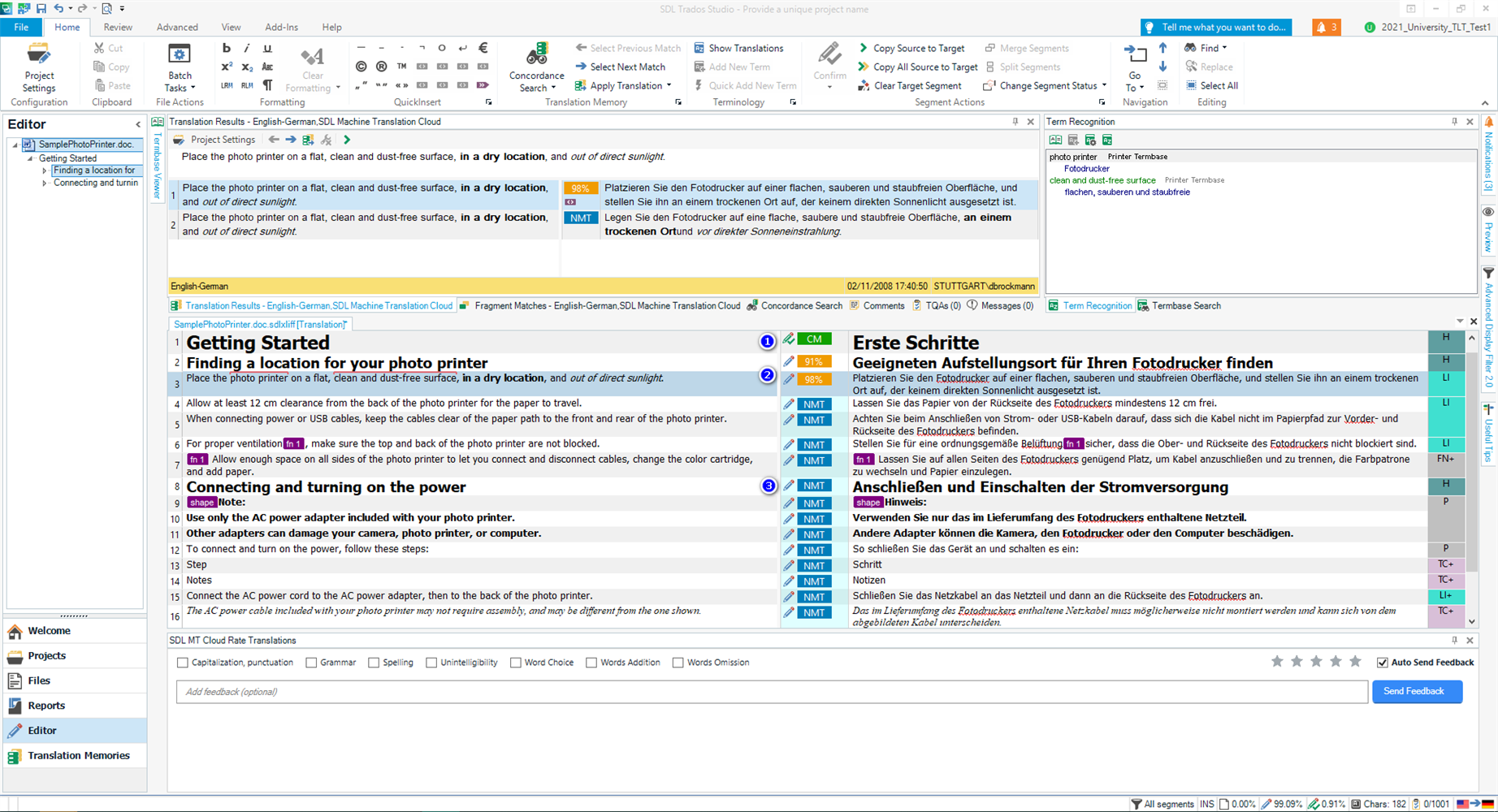 In this example, as Machine Translation Cloud was added to the project, the project has been largely 'pre-translated'.