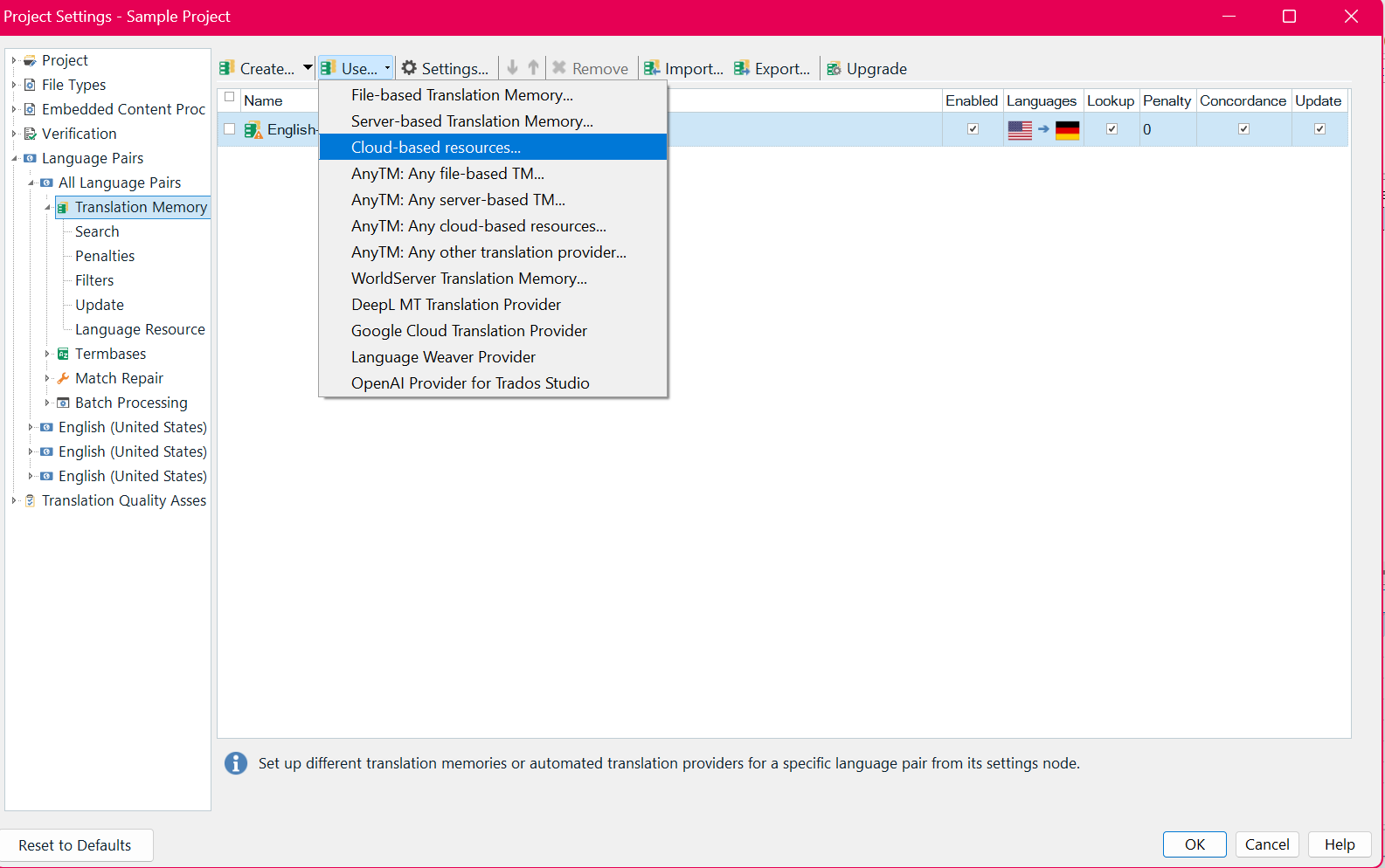 Select required Translation Memories (local/server) and Machine Translation provider(s)*