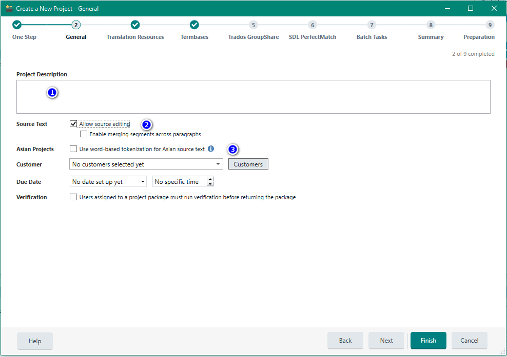 2) Select whether you wish to be able to Allow source editing (Enable merging segments across paragraphs (you can change the settings at any time)