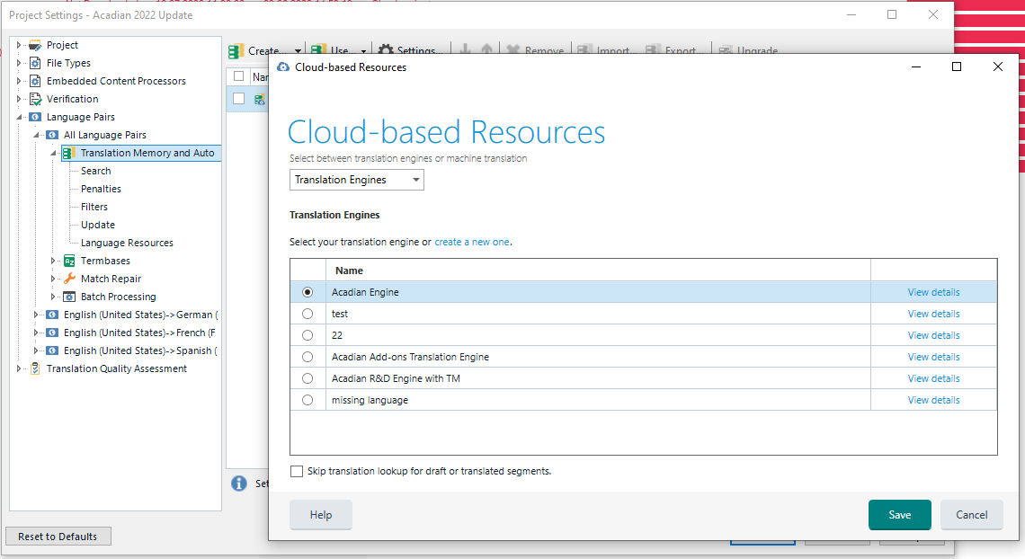 [mention:210afad9abdc44dcb7d3d359e6c4fad9:e9ed411860ed4f2ba0265705b8793d05] This should already be possible in Studio, by using the Project Settings->Language Pairs->Translation Memory->Use->Cloud based resource->Translation Engine.