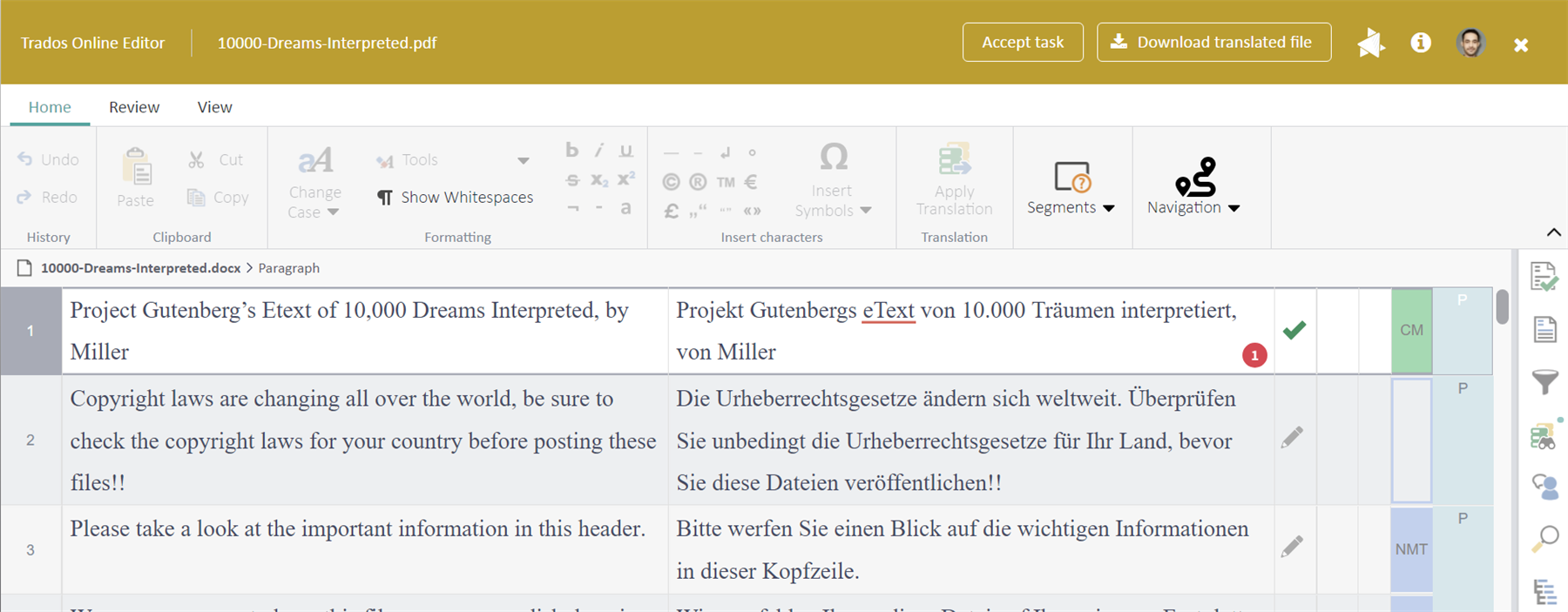 A button to accept as well as complete a task was added to the Online Editor, to allow users to stay on the site/tab after e.g. reviewing the content before deciding to accept the task assigned to them. An example: