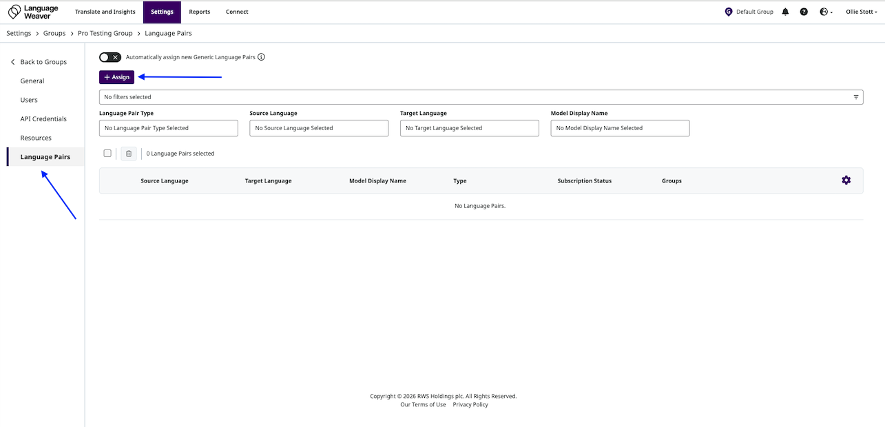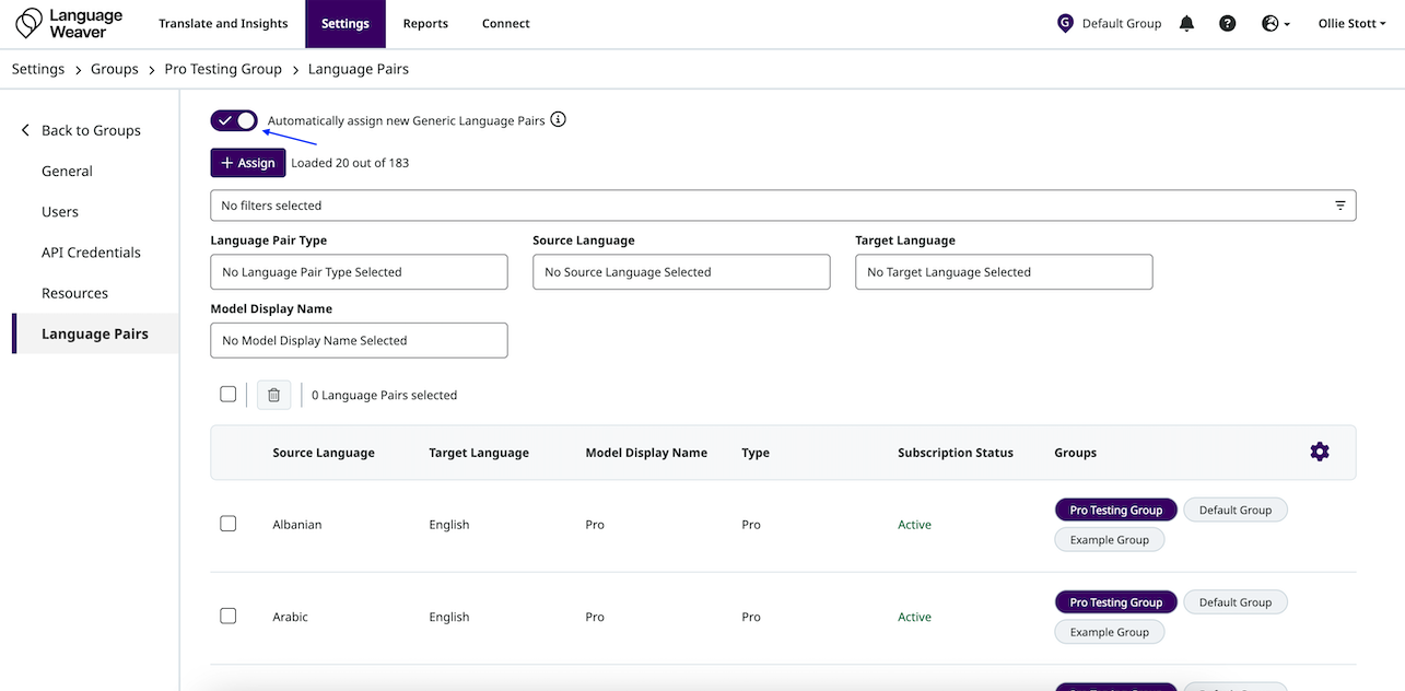 - The "Automatically assign new Generic Language Pairs" toggle can be switched on to automatically assign any new eligible language pairs for the account (such as new Pro or Nerual language pairs) to the Group