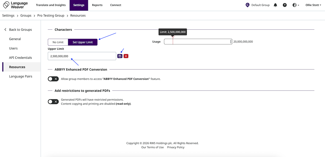 - By default, new Groups will have no limit on their character volume, and will share the overall account volume