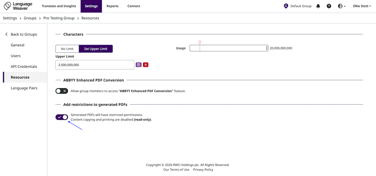Group-Based Permissions: Language Pairs, Character Volumes, PDF Restrictions