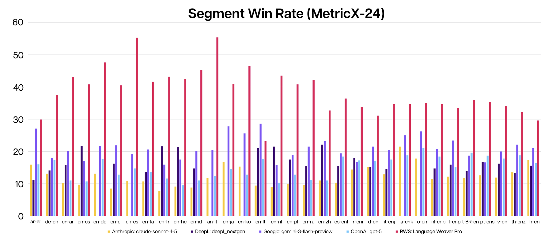 The major recent update is the release of our latest model - Language Weaver Pro. Language Weaver Pro offers vastly enhanced translation quality, leading against alternative AI models on multilingual tasks across both human and widely recognised automated evaluations. The full whitepaper outlining the evaluation, methodology, and results is available here: https://www.rws.com/language-weaver/pro-benchmarking/