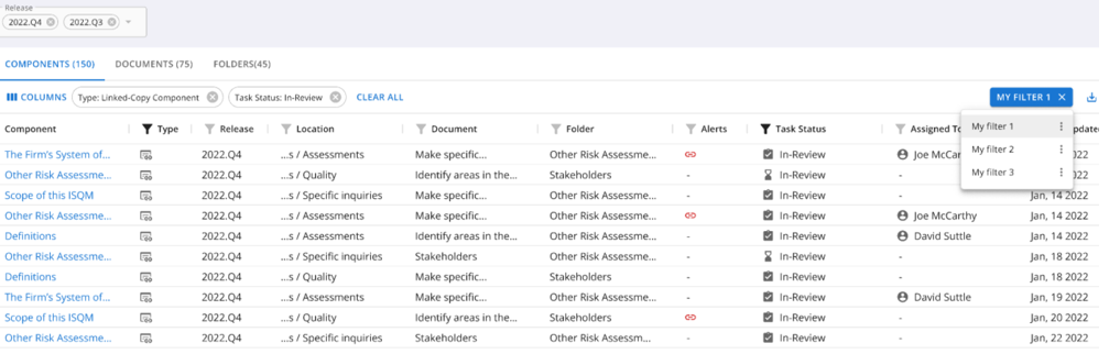 In the release we have introduced functionality to allow users to view, sort, and filter information for each component, document, and folder within a Collection release. They can also customize displayed columns, with preferences retained for future visits. In addition we have extended the information available to include system information (e.g., date updated, component type, task status) and metadata. Users can also export this data for external processing. Finally, this release, includes changes to the UI, filtering, and sorting to enhance dashboard usability.