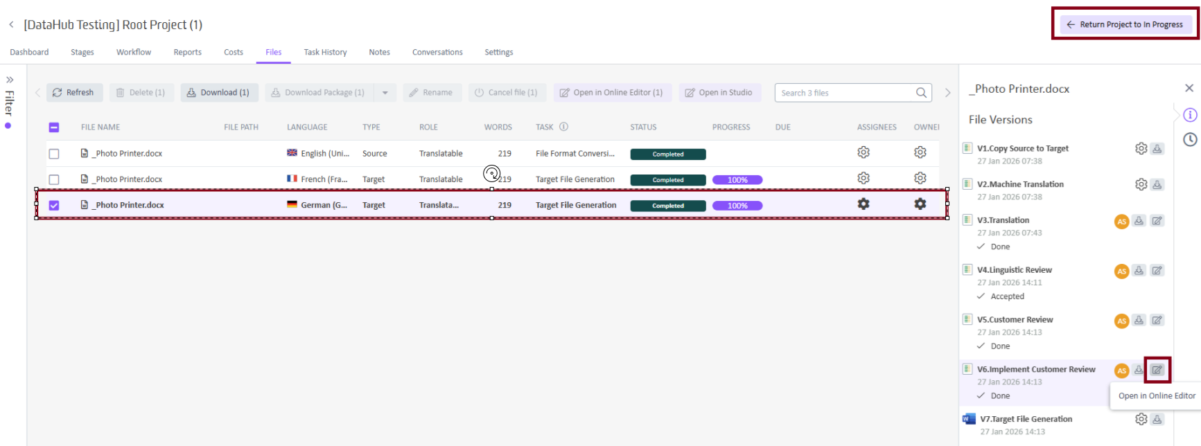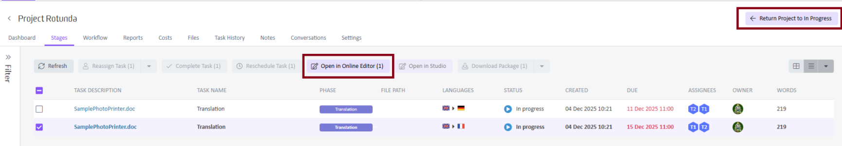 - Available for Translation, Linguistic Review, Customer Review, and Implement Customer Review tasks