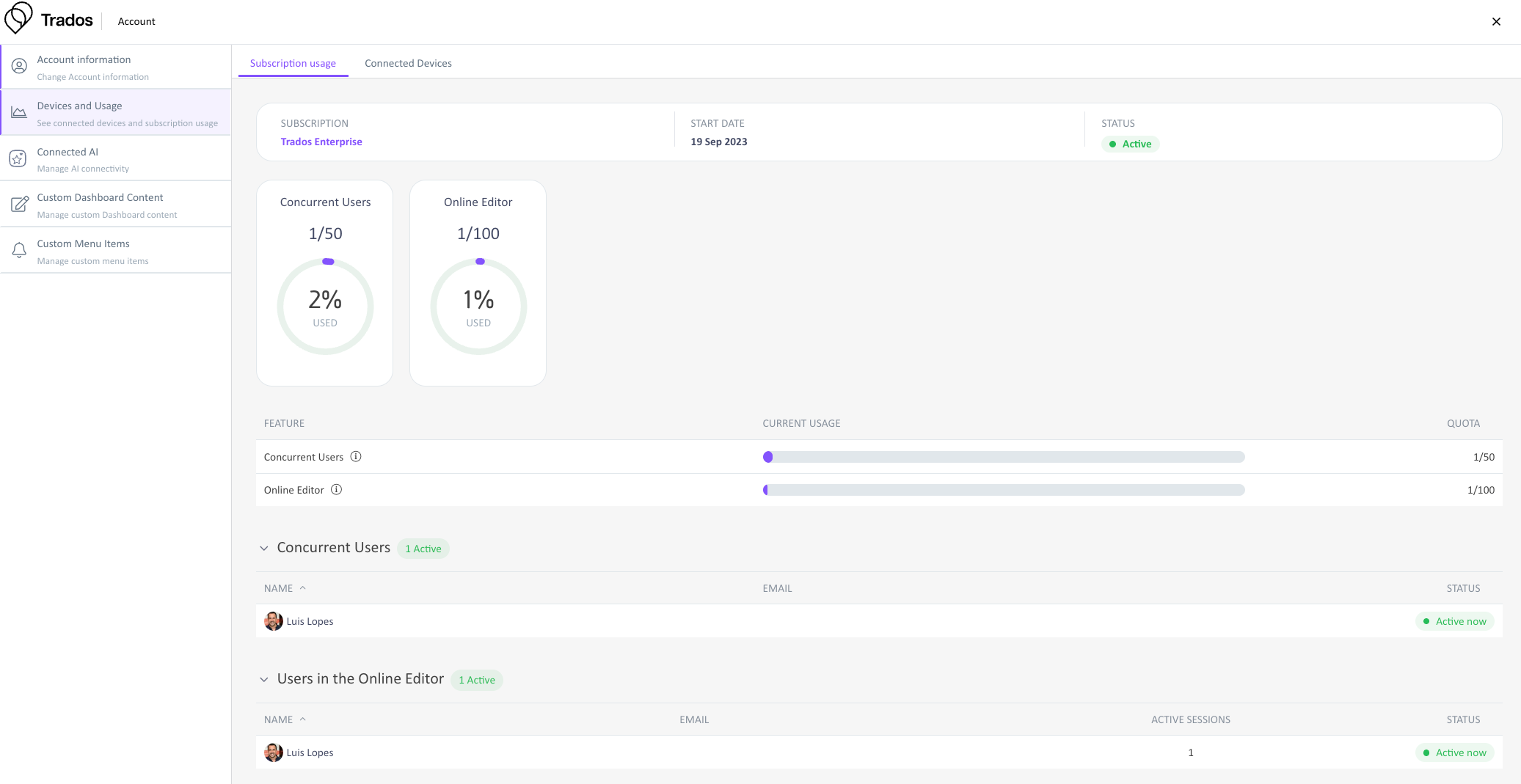 Located under Account Management -> Devices and Usage -> Subscription usage, administrators can now easily track exactly how many licenses are being consumed at any given time. The dashboard also provides granular details on which specific users are actively consuming Online Editor and concurrent access licenses, making it much easier to manage your team's capacity and determine if additional licenses are required.