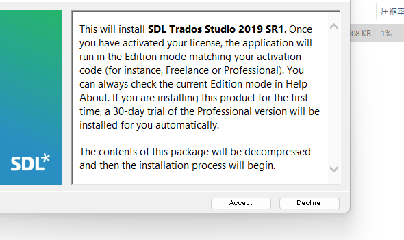 Installation prompt for SDL Trados Studio 2019 SR1 explaining that once the license is activated, the application will run in the Edition mode matching the activation code and a 30-day trial of the Professional version will be installed if it's the first time installation.