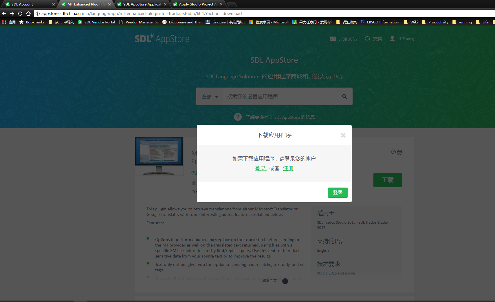 Hi, I‘m trying to download the MT Enhanced Plugin for Trados Studio, but the appStore just not work. It asked me login again and again and again...even I've already logged in. I've tried all kinds of ways - restart my computer, use different browsers (IE, Chrome, Firefox), clear the caches, logout and login again, but none of them worked. Can anybody help?