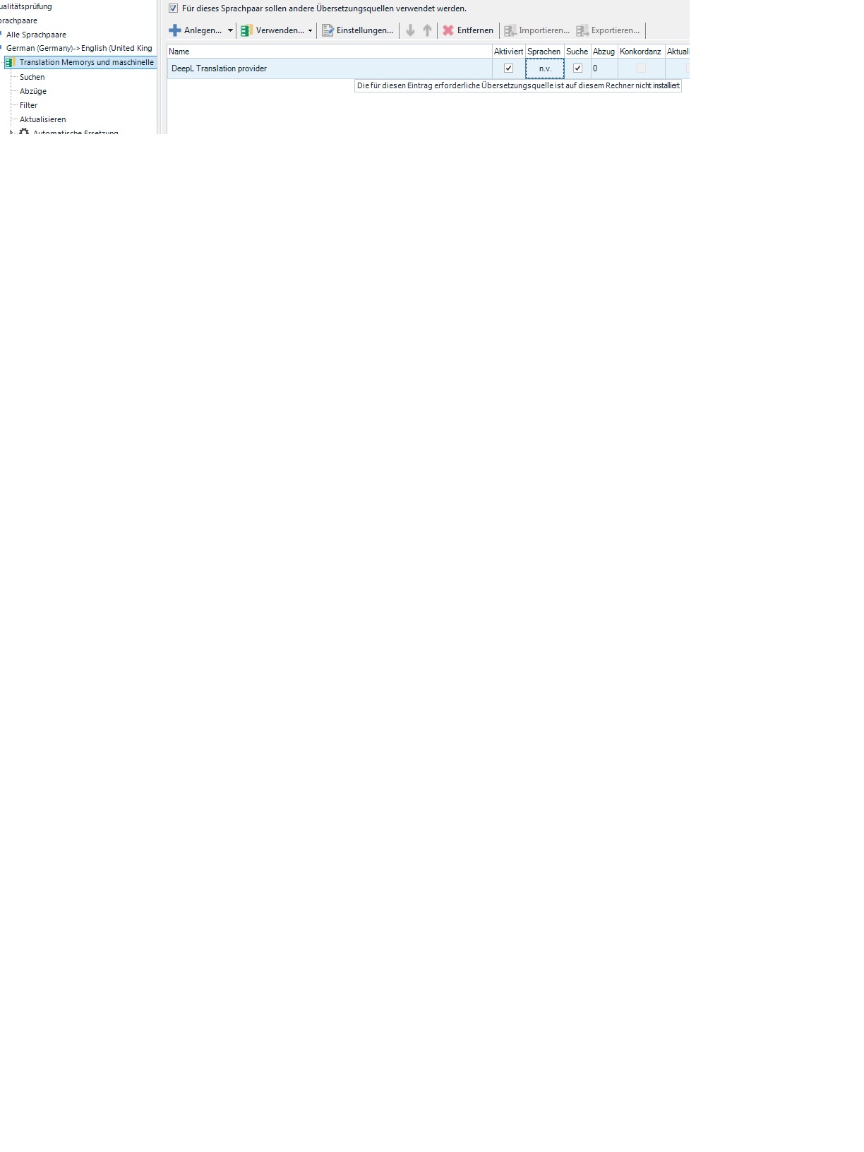 I managed to purchase a subsription and an API key for the DeepL plugin. I entered the API key as requested, but there are still no translation suggestions. The fly-by text over the deepL TM entry says the translation source for this entry is not installed. The language pair is German to English, however, which should not be a problem. In a newly created project, it does give me suggestions - but in French! See attached image below. Can this be solved?
