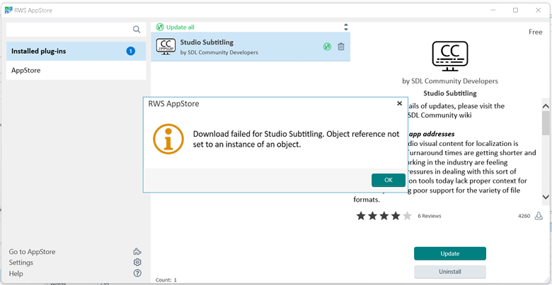 I would ask for the stack trace, but after seeing your other post I think it's probably because you are using the Starter Edition of Trados Studio. You need Freelance at least to be able to work with the apps.