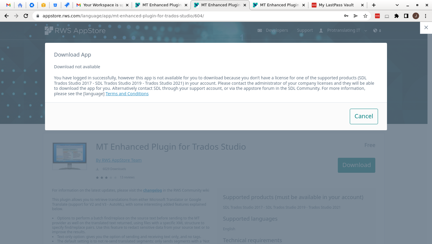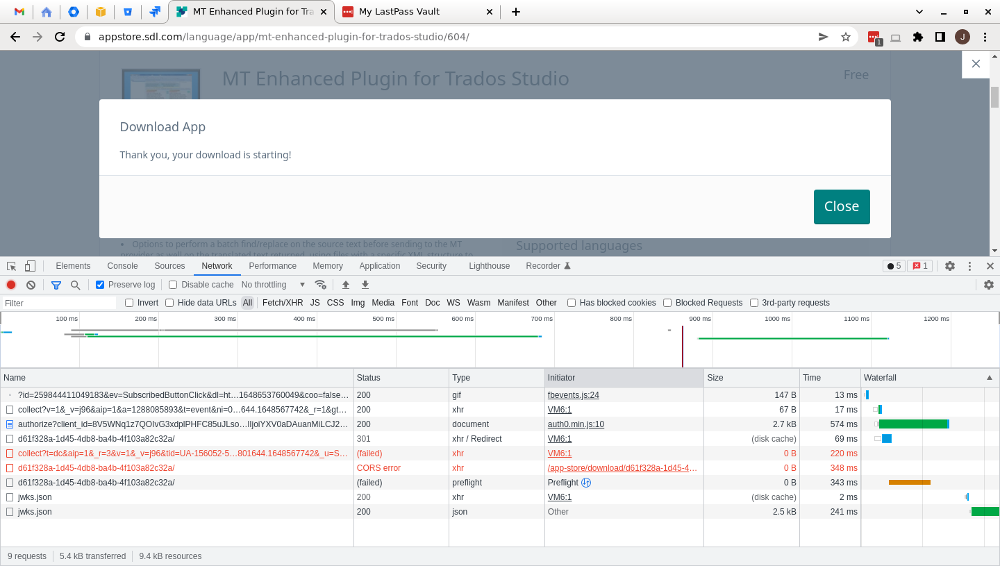Hi, there seems to be an issue downloading the MT Enhanced Plugin for Trados Studio 2017. The file never starts downloading; Chrome developer console shows that the link to the actual file errors out, as you can see in the screenshot below.