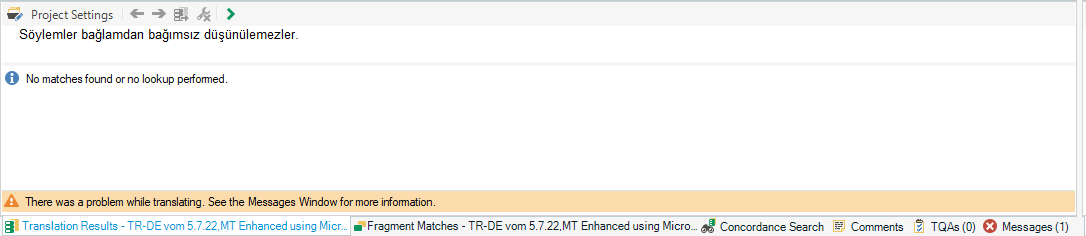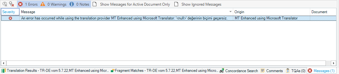 I try to translate a turkish .docx document into english. When I click on the segment, the error appears. It says "the value of '<null>' type is invalid".