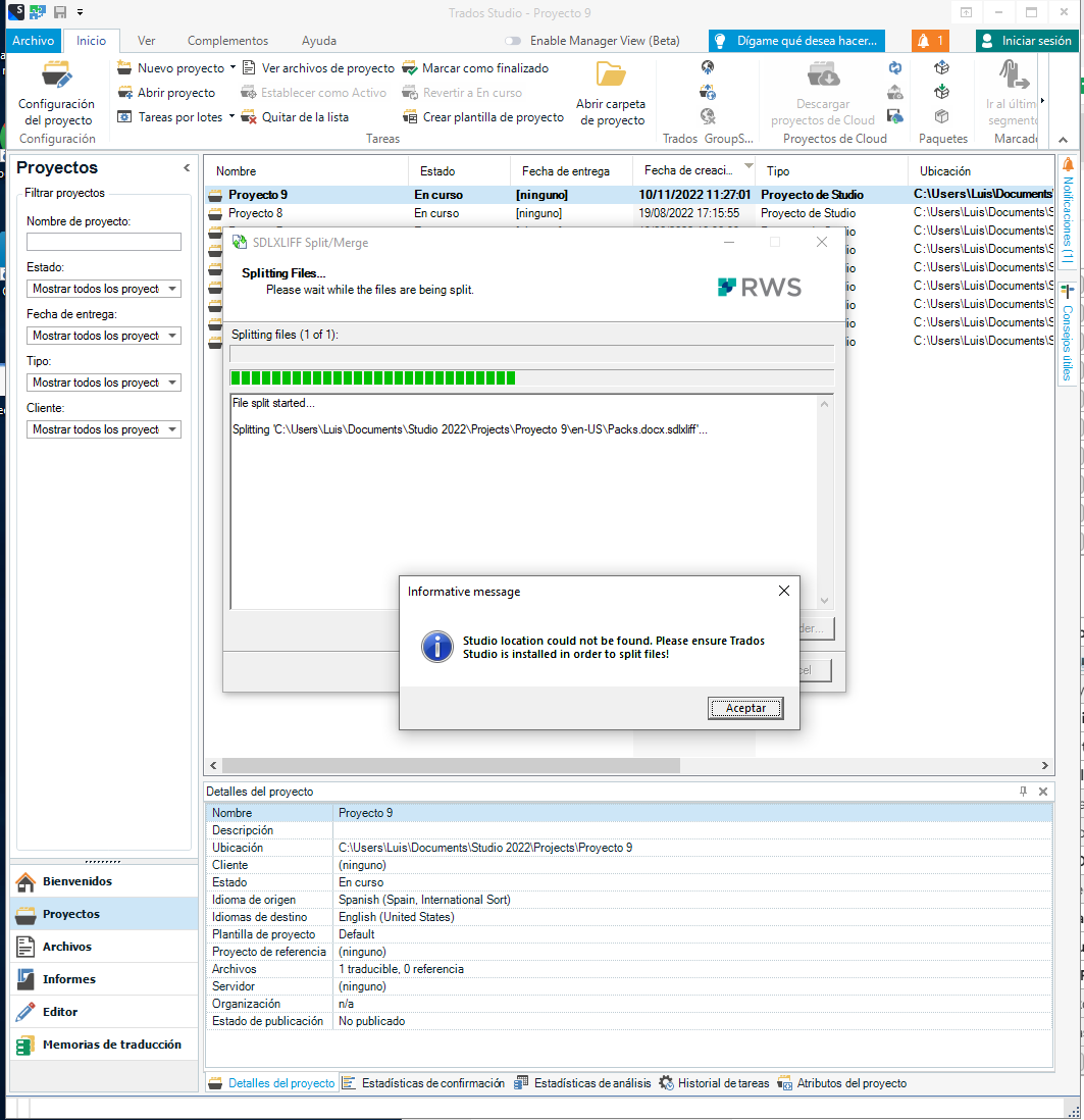 However, when we try to split a file we got the error "Studio location could not be found. Please ensure Trados Studio is installed in order to split files!". See screenshot below.