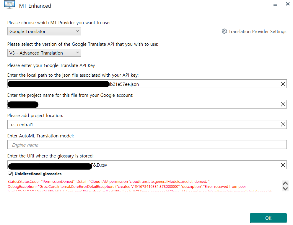 Status(StatusCode="PermissionDenied", Detail="Cloud IAM permission 'cloudtranslate.generalModels.predict' denied. "