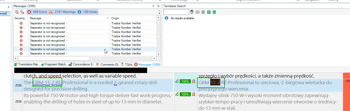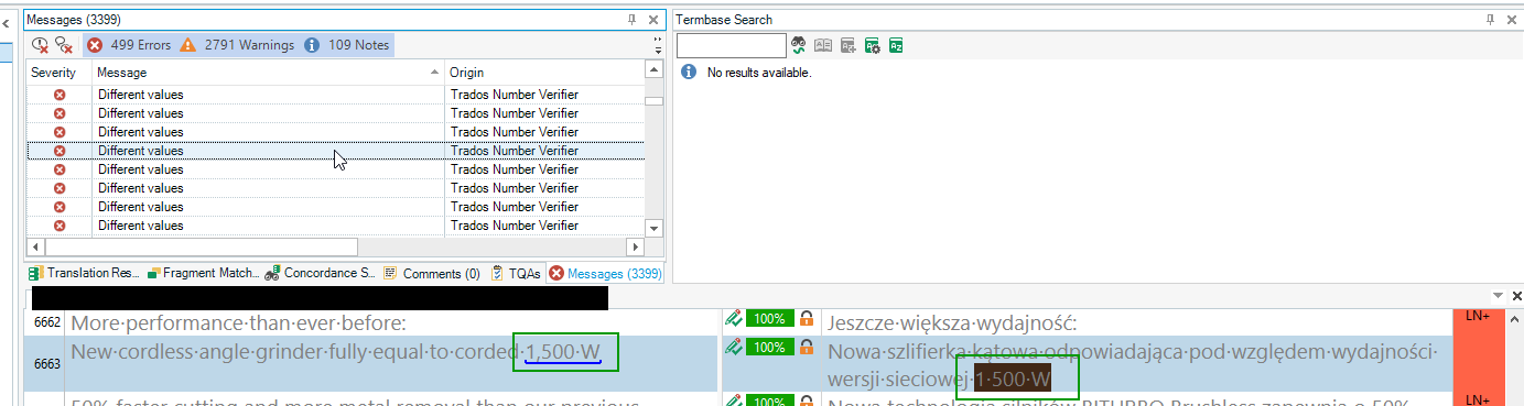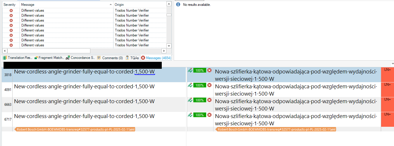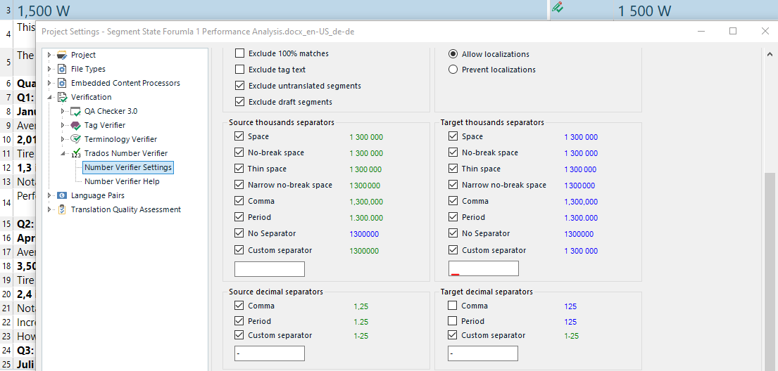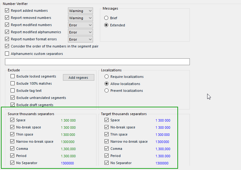 In the example below we should not get an error message according to our settings. We allow commas as thousands separators in the source and spaces in the target.