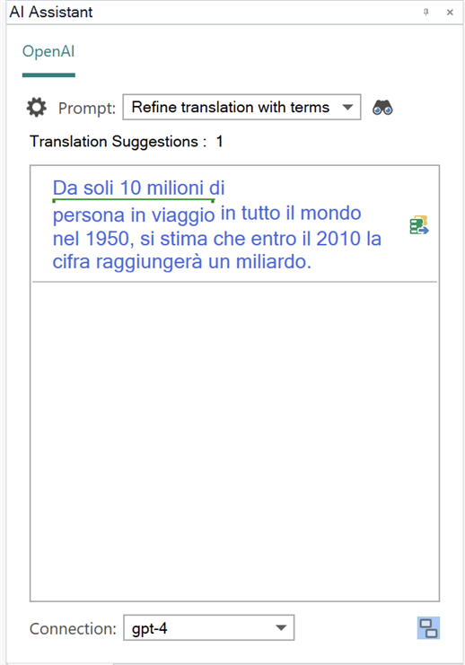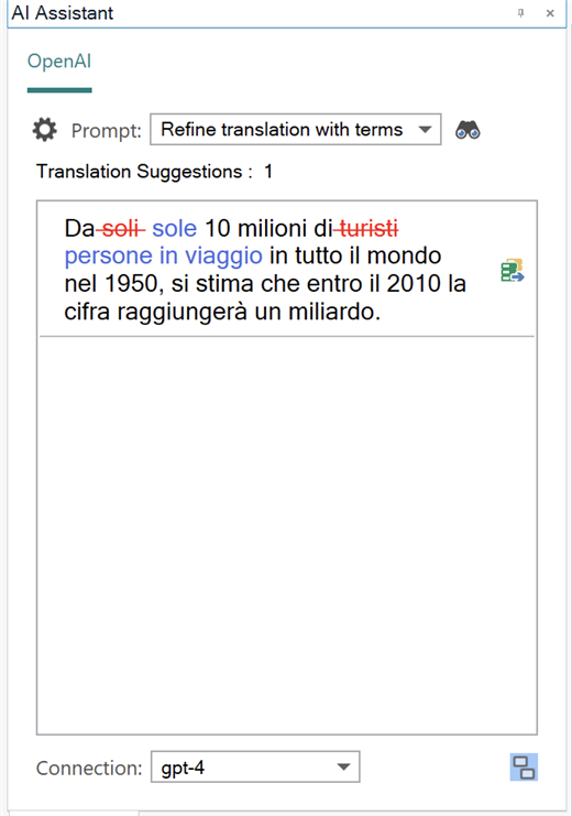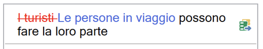 Comparing the last screenshot (track changes showing) with the screenshot without track changes, you'll notice that there is a difference in adaptation of the sentence to the terminology injected (tourist = persona in viaggio).