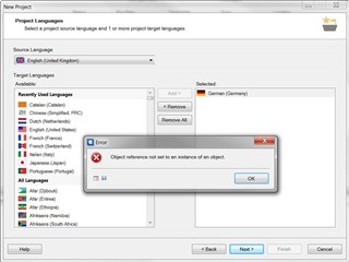When I try to create a project in Studio 2017 based on a previous project I get the error message "Object reference not set to an instance of an object" when I reach the Project Languages window. No matter if I leave the same language combination or if I change them, I always get that message when I click on "Next".