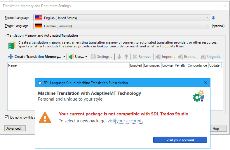 Error message in Trados Studio stating 'Your current package is not compatible with SDL Trados Studio. To select a new package, visit your account.'