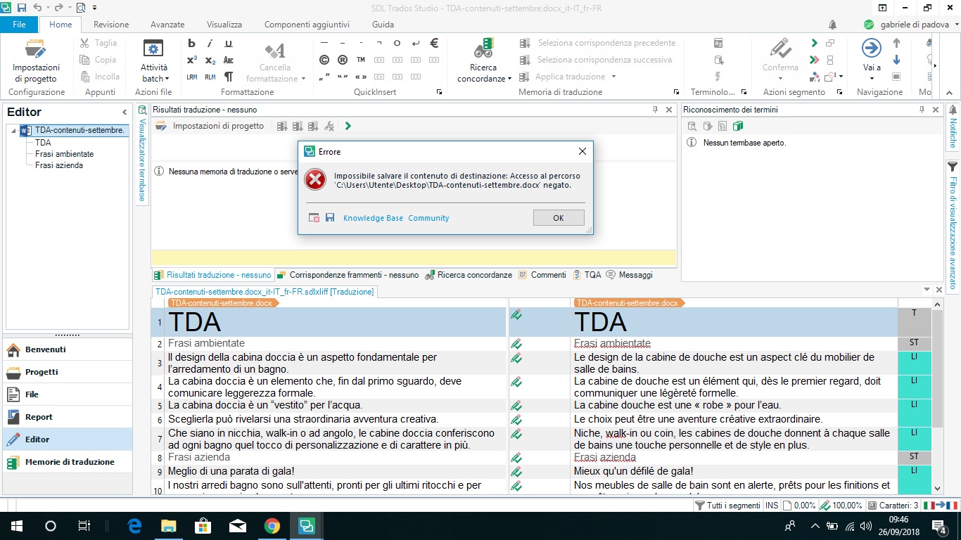 I am writing you because of a problem during the saving process. I translate a word document like I usually do, but when it comes to save the target as, an error message appears: "Impossibile salvare il contenuto di destinazione. Accesso al percorso (....) negato" ("Unable to save destination content. Access denied"). I have never had such a problem until lately, and I don't know what the cause might be. I wonder if it might have anything to do with my anti-virus program. You can find attahed a screenshot.