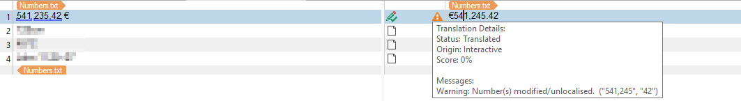 I cannot seem to get number verification to work in Trados Studio, either with the standard "check numbers" option or with the "number verifier" plugin. For example, if I have 541 235,42 € in the source and €541,235.42 in the target, it reports it as an error "number is missing in target segment or is not properly localised". This is because it doesn't like the currency symbol attached, even though this is correct. Ignoring these errors is not an option because if a number is simply wrong, the exact same error is shown. As it happens, I always run an additional quality check in XBench, so I can afford to turn off number checking in Studio; however, I find it hard to believe that this basic functionality is not there and would rather pick up such errors as soon as possible.