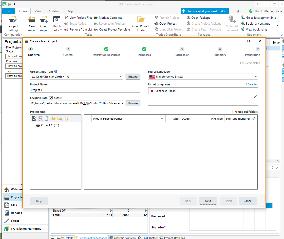 Screenshot of SDL Trados Studio 2019 showing the New Project wizard with 7 steps visible, missing the Perfect Match and GroupShare options.