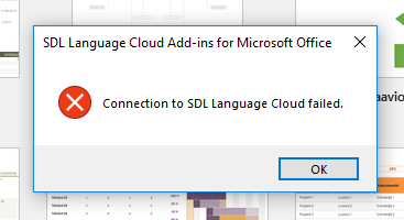 Error message from SDL Language Cloud Add-ins for Microsoft Office saying 'Connection to SDL Language Cloud failed.'