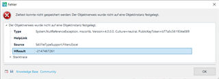 beim Speichern der Excel-Zieldatei unter SDL Studio 2017 SR1 kommt die Fehlermeldung "Der Objektverweis wurde nicht auf eine Objektinstanz festgelegt"