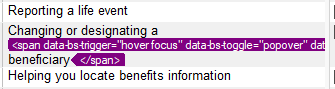 Screenshot displaying HTML code for a popover definition, with 'span' tags around the word 'beneficiary' in Trados Studio.
