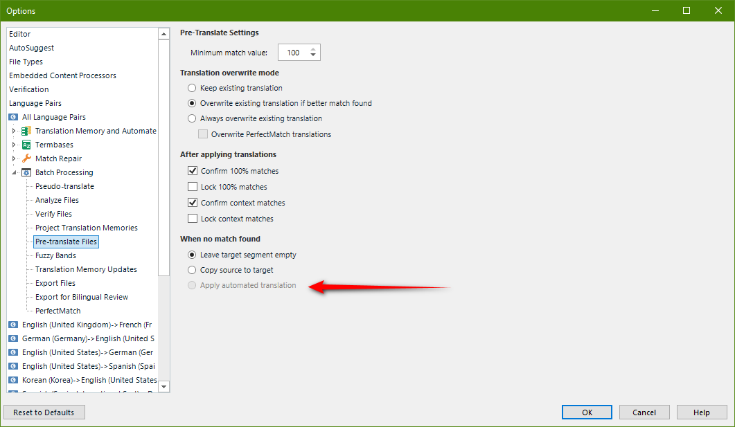 The NMT results are applied to the untranslated segmetns after running the batch task "Prepare". This happens although the option under File > Options > Editor > Automation is disabled.