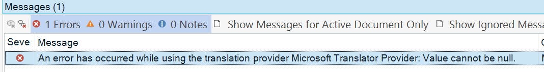 Trados Studio error message stating 'An error has occurred while using the translation provider Microsoft Translator Provider: Value cannot be null.'