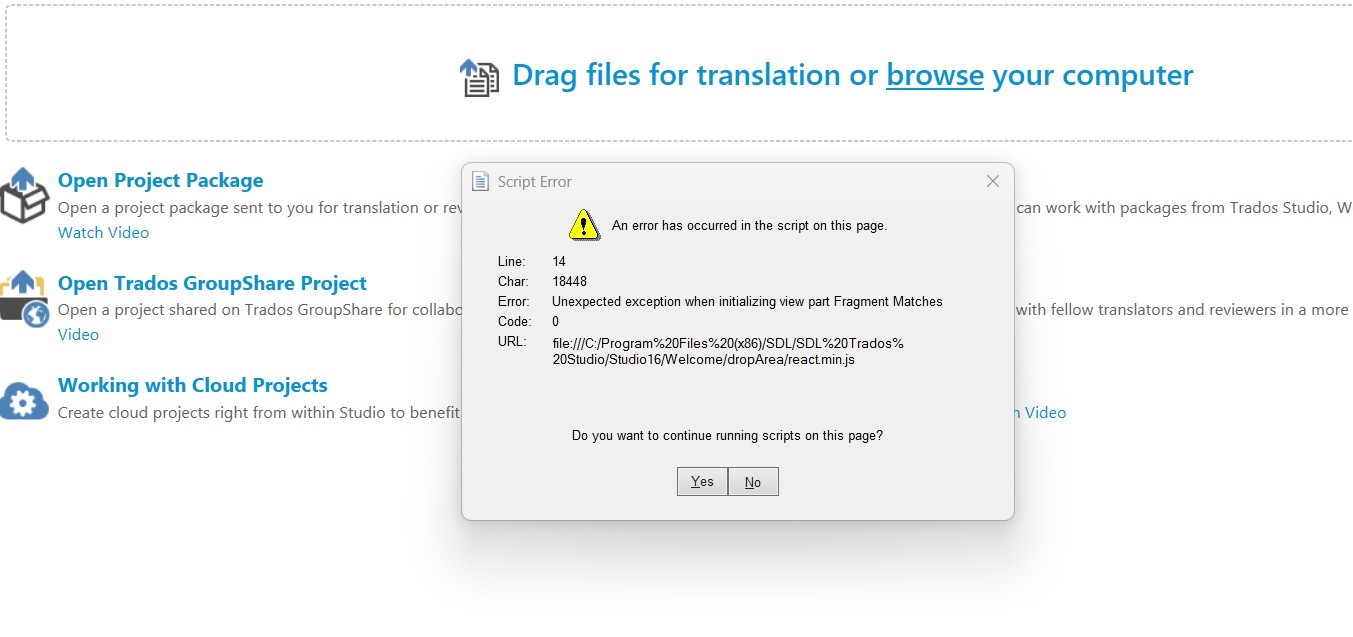 SDL Trados Studio 2021 SR2 16.2.12.9338 - Script Error "Unexpected exception when initializing view part Fragment Matches"