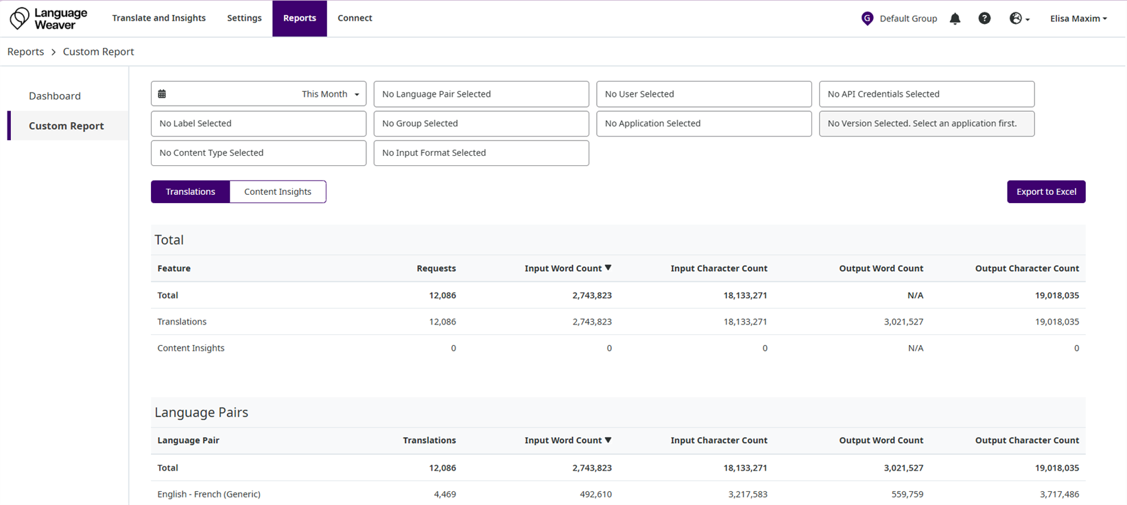 You can also access your data directly via https://portal.languageweaver.com/reports/dashboard