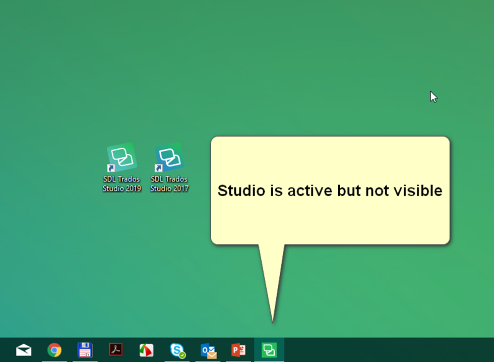 ...and when clicking on Studio you see Studio is indeed active (you see a slight change in the icon colour) in the task bar-but still the program is nowhere to be seen!