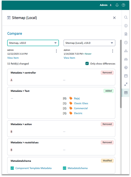 Version compare also supports comparison between localized organizational items, such as folders and structure groups, and their parent items. From the comparison view, you can open, roll back to, or delete a historical version directly, and we've improved performance for items containing large blocks of text.