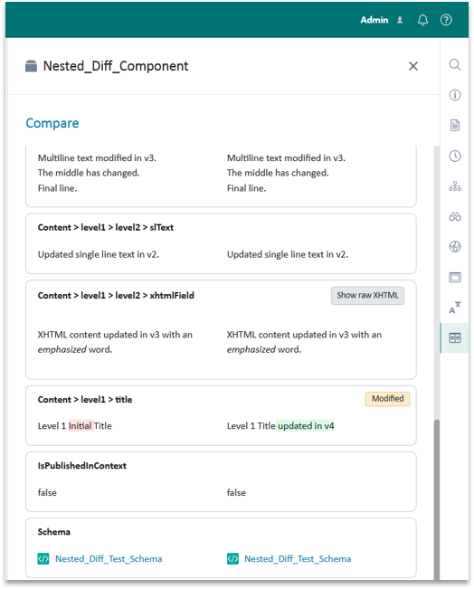 By default, only properties and fields that differ between versions are shown, keeping the view focused and readable. For those working with rich text, there's a toggle between rendered and raw XHTML views. Item links such as components, schemas and keywords remain navigable within the comparison view, and options can be filtered by name, version or URI for quick access when many versions are available.